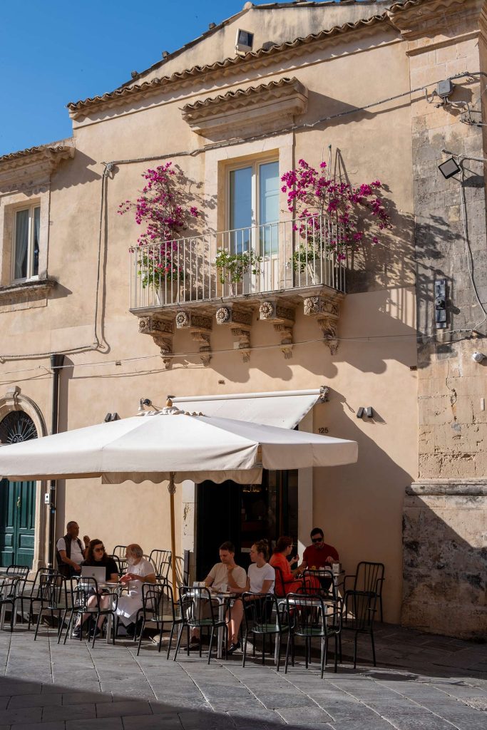 It’s eight o’clock on a balmy spring morning in the baroque town of Noto. Shopkeepers are opening their shutters on the main street of town as I approach the unassuming shopfront of Caffè Sicilia. The café’s limestone façade is bathed in sunlight, the shadows of potted fuchsia blossoms on a corbelled balcony above dancing across its surface.